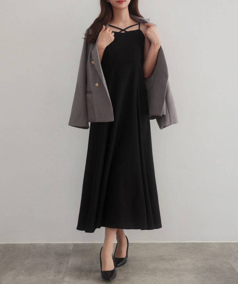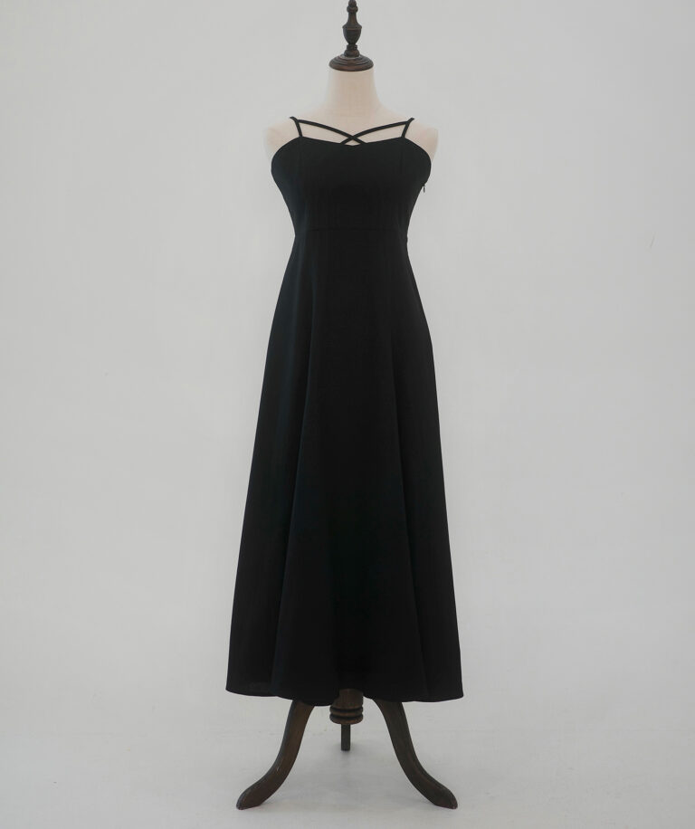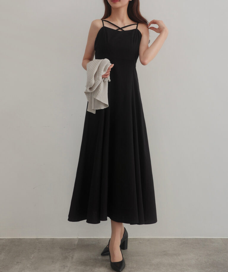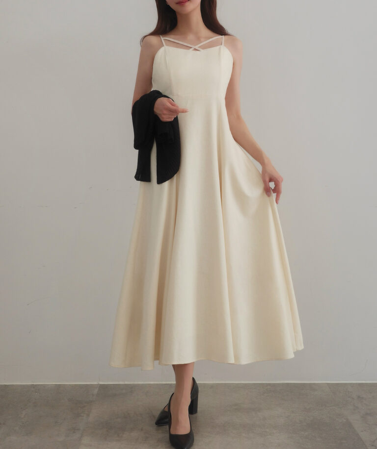 また、胸元は華奢なクロスデザインで女性らしい印象に導き、