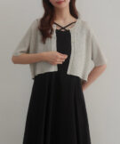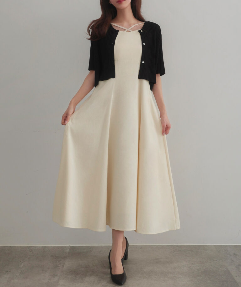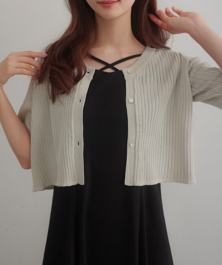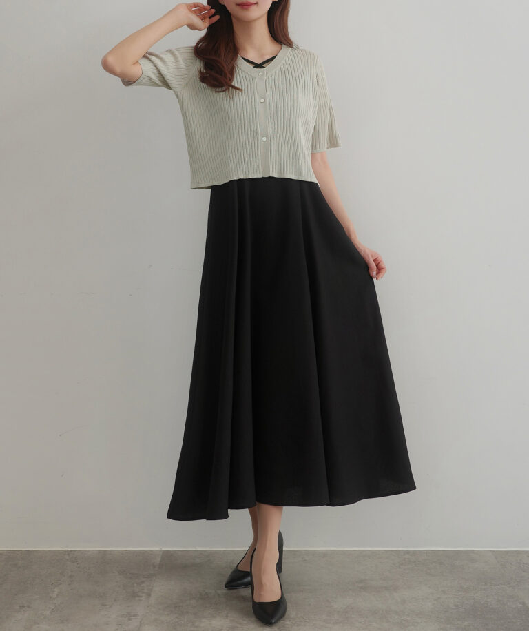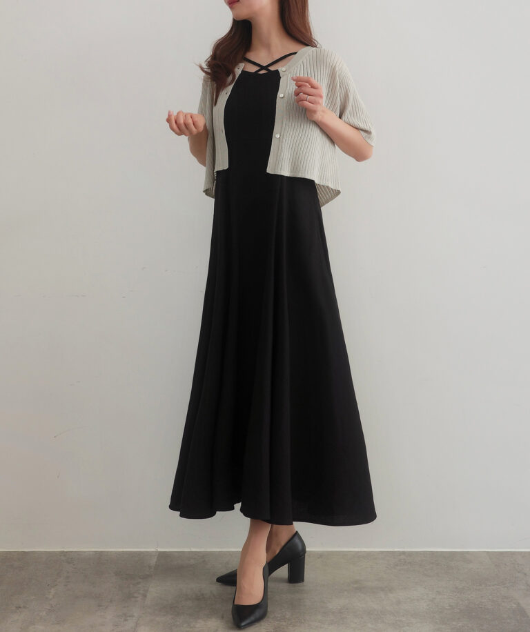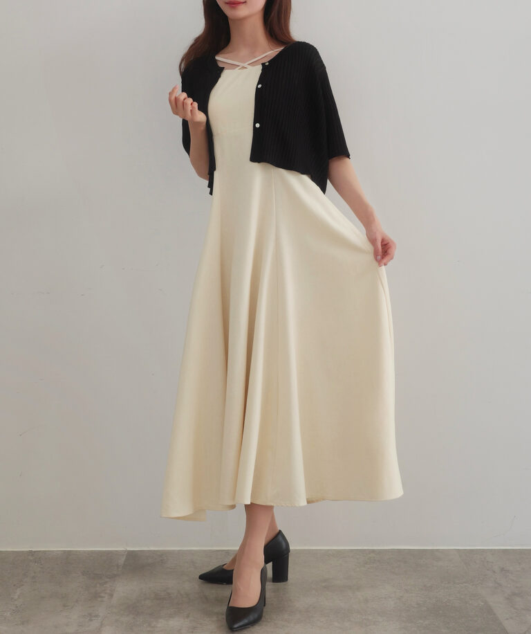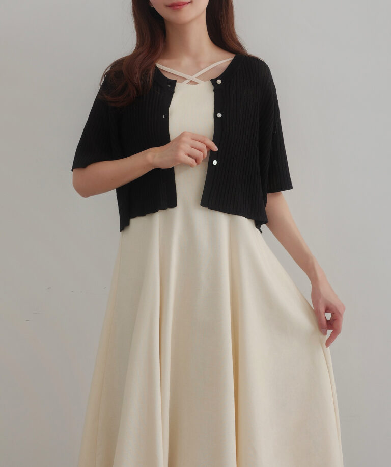 【024】シアー半袖リブカーディガン+リネンフレアキャミワンピース set