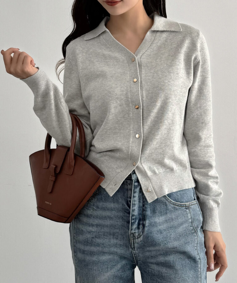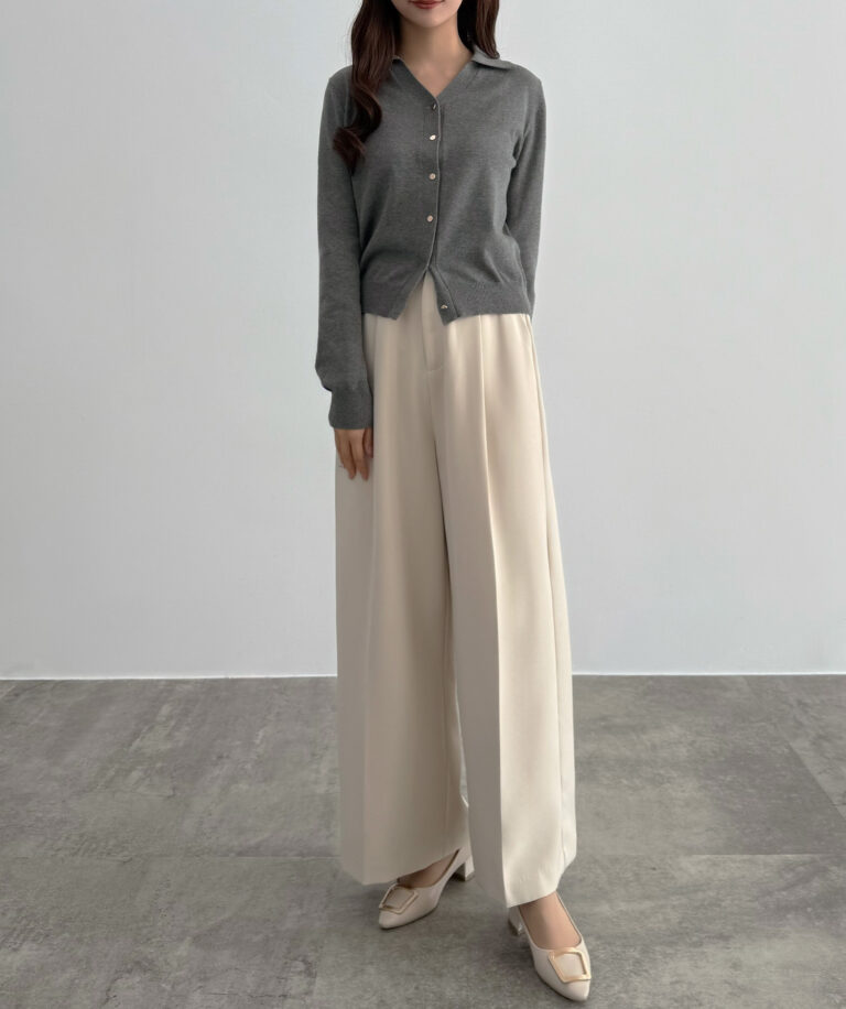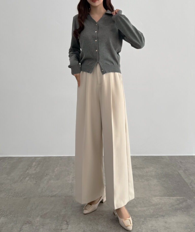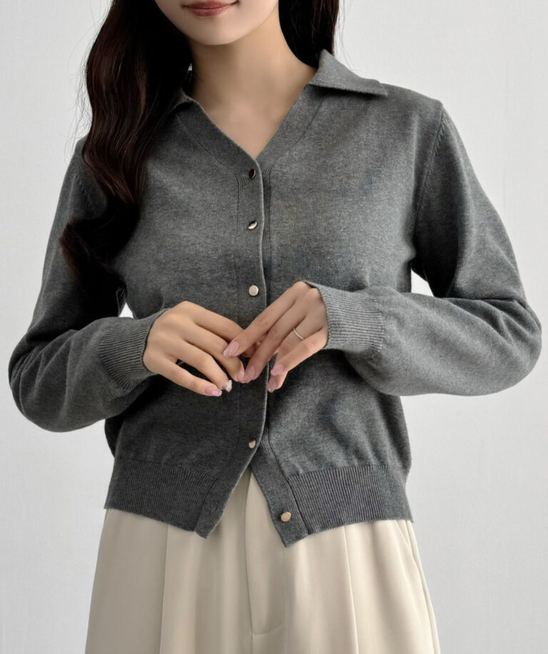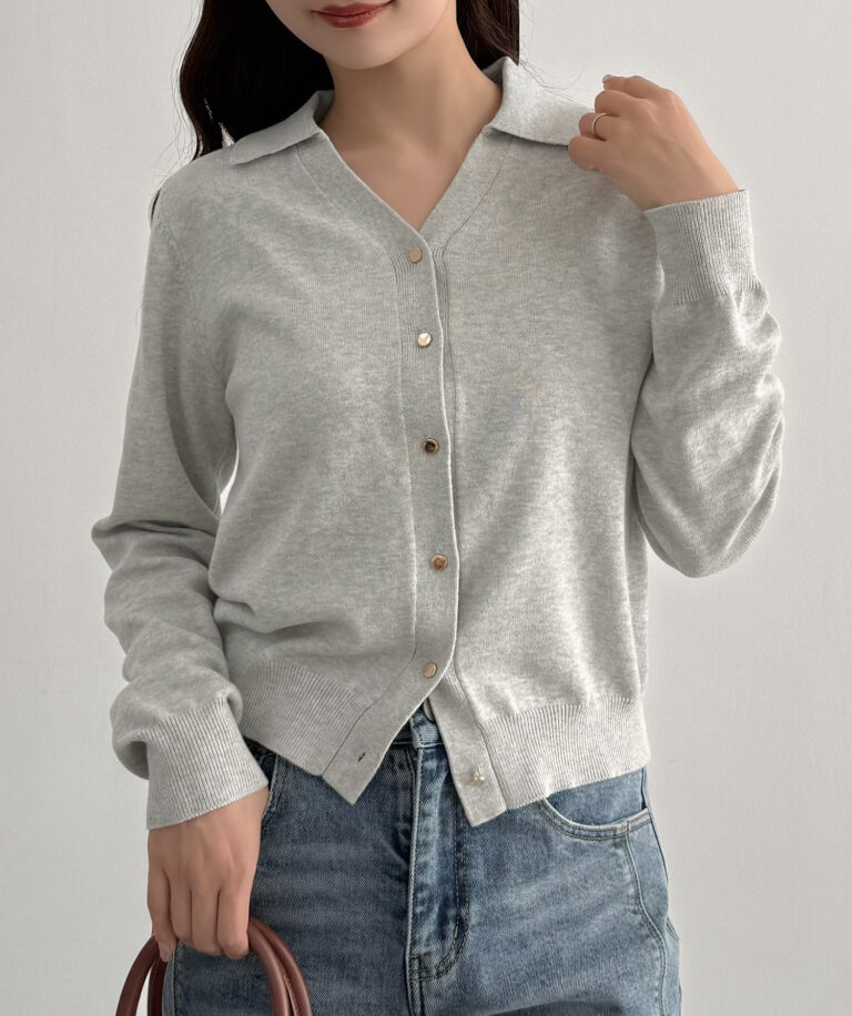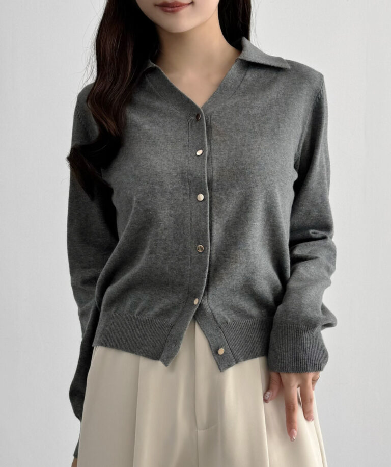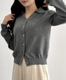 襟元はVラインのポロネックで、大人っぽくも抜け感のある印象になるカーディガン。