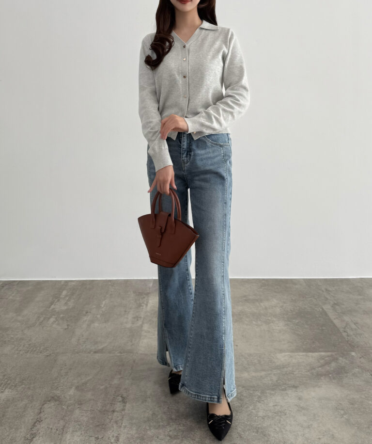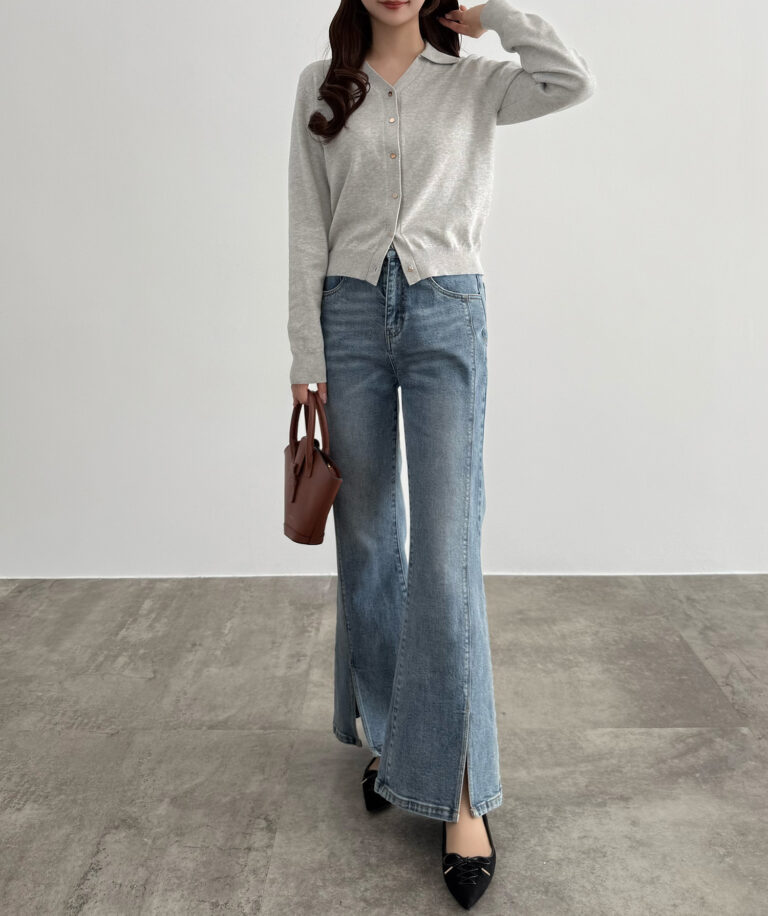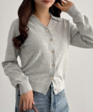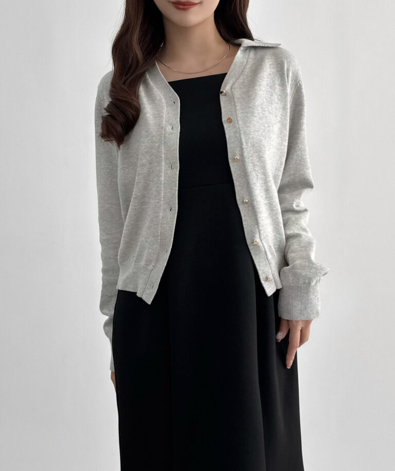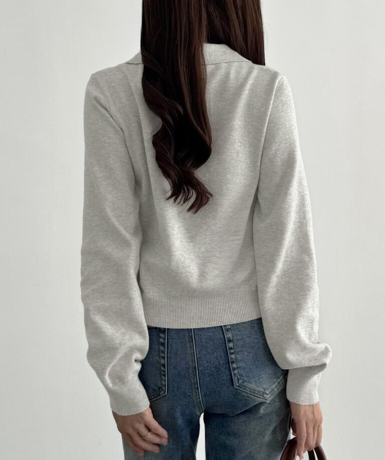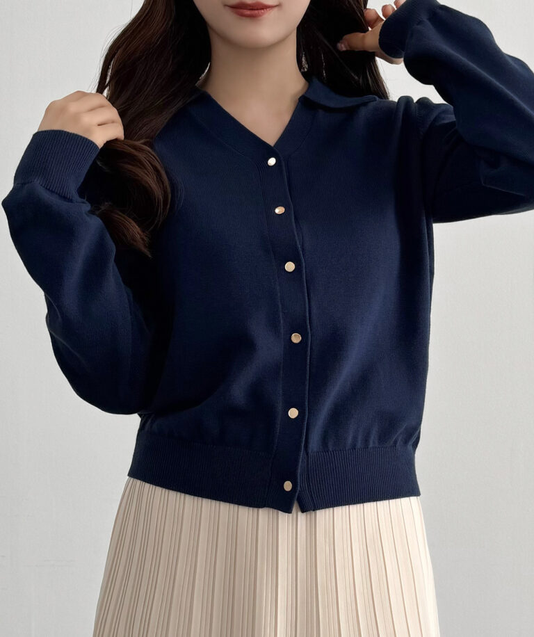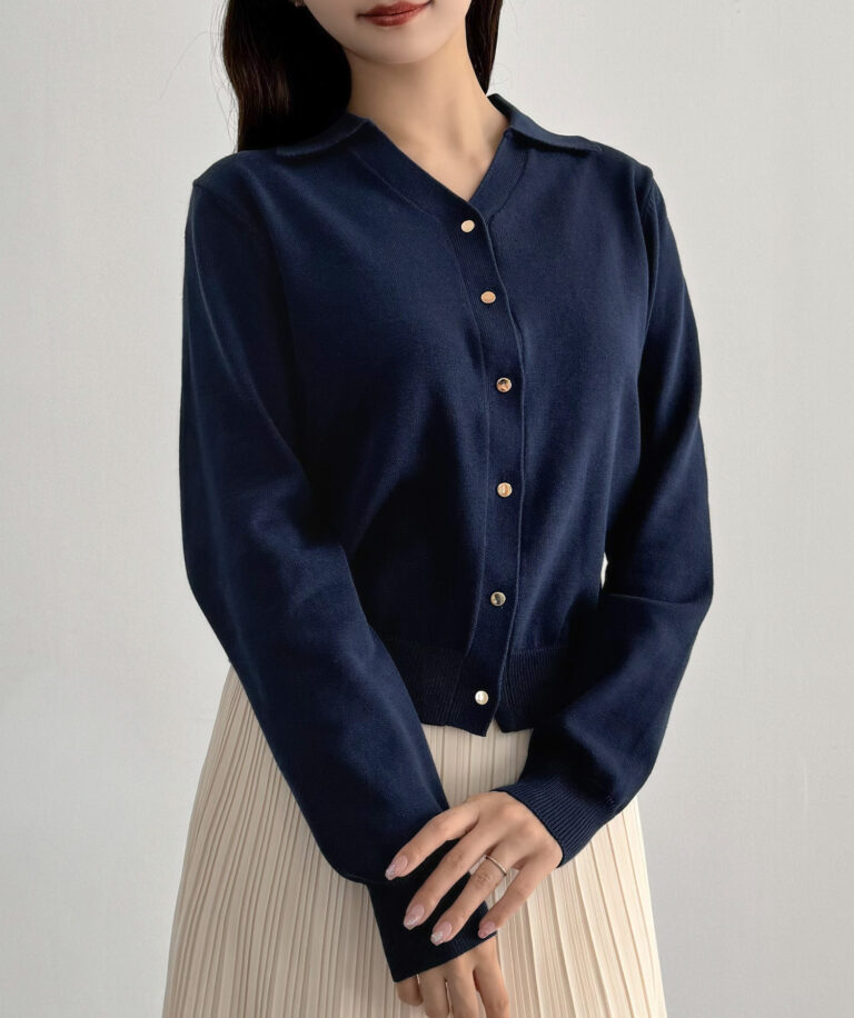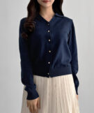 襟元はVラインのポロネックで、大人っぽくも抜け感のある印象になるカーディガン。