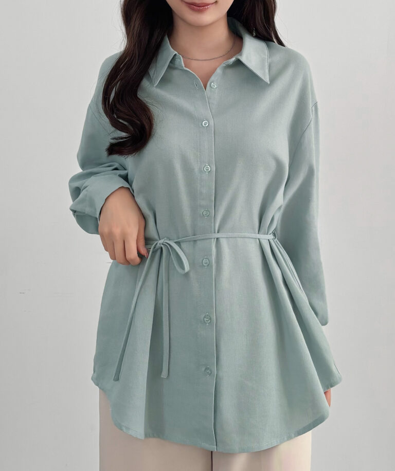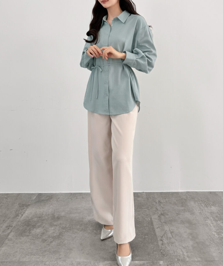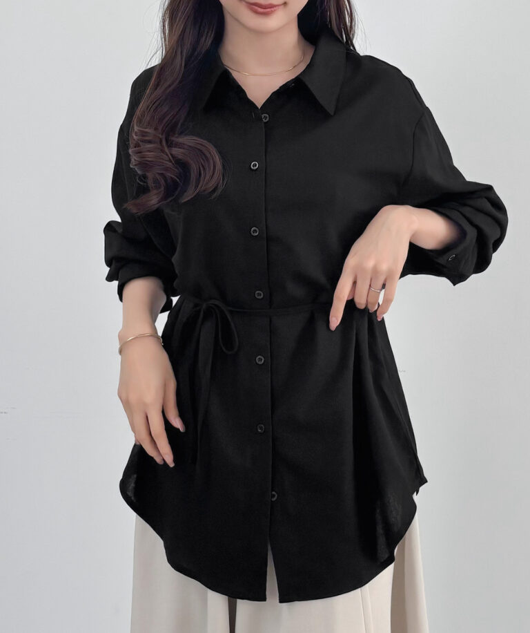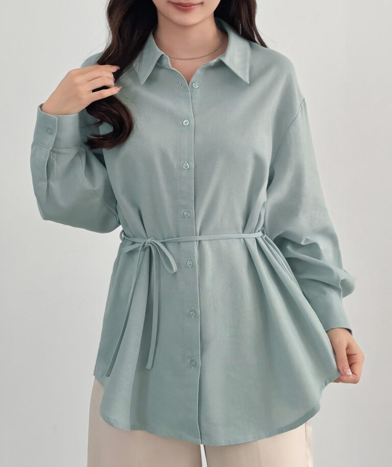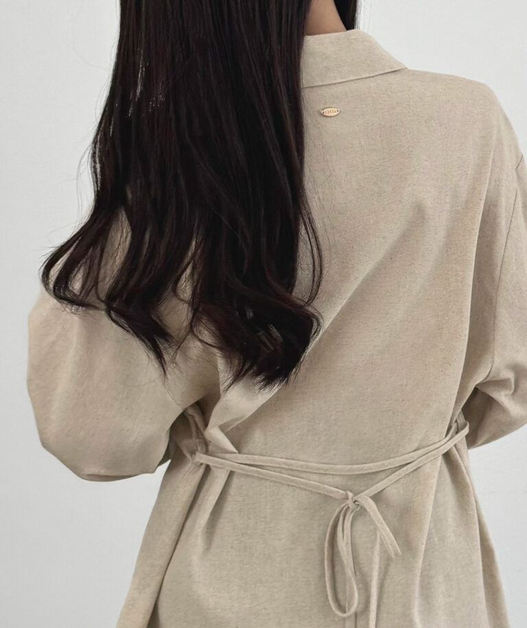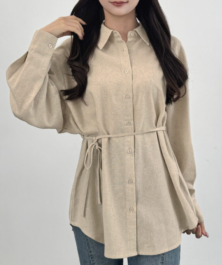 スタイル綺麗見せが叶ベルト付きうリネン混シャツ。