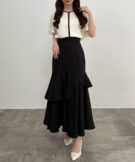 袖はふんわり広がるフレアスリーブで、気になる二の腕をかわいらしくカバー。